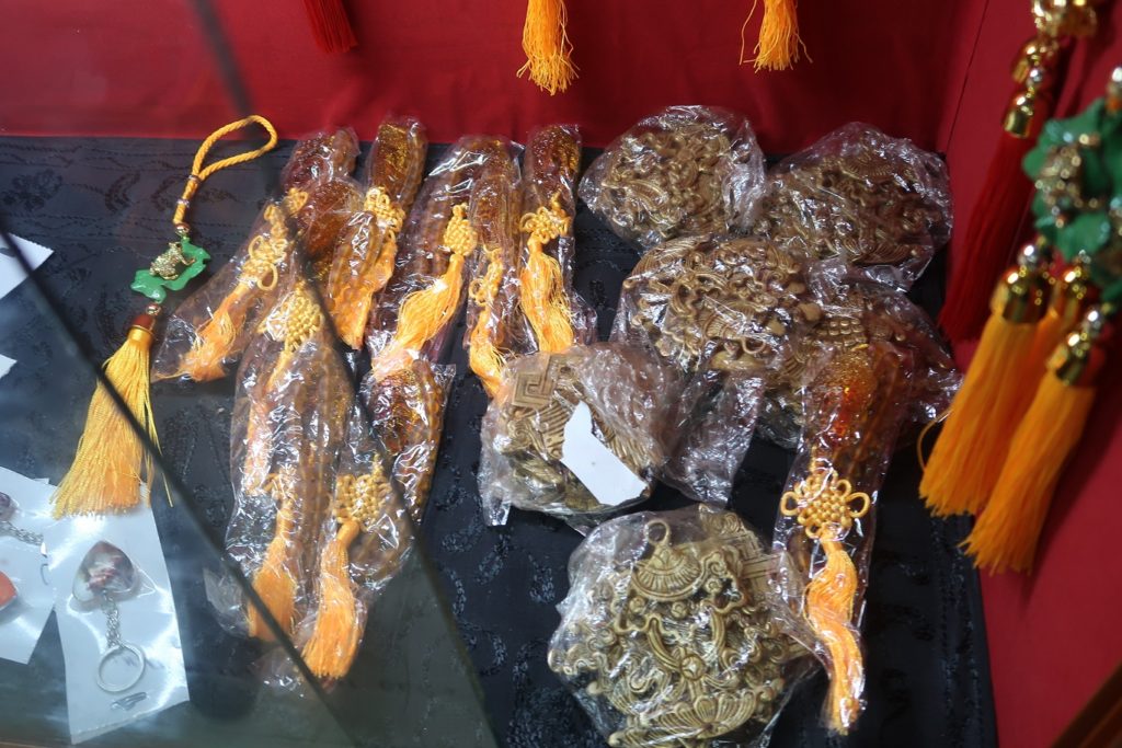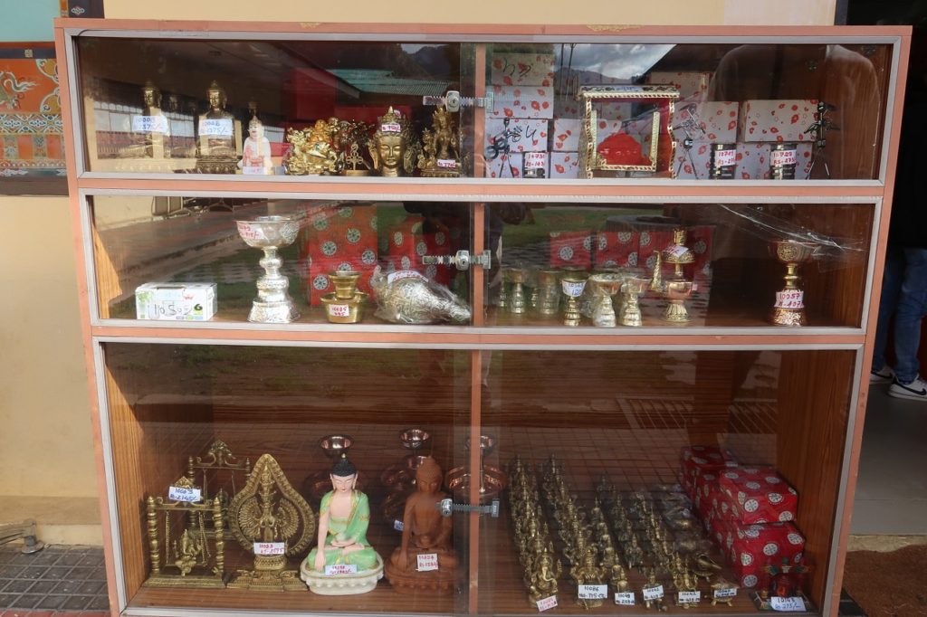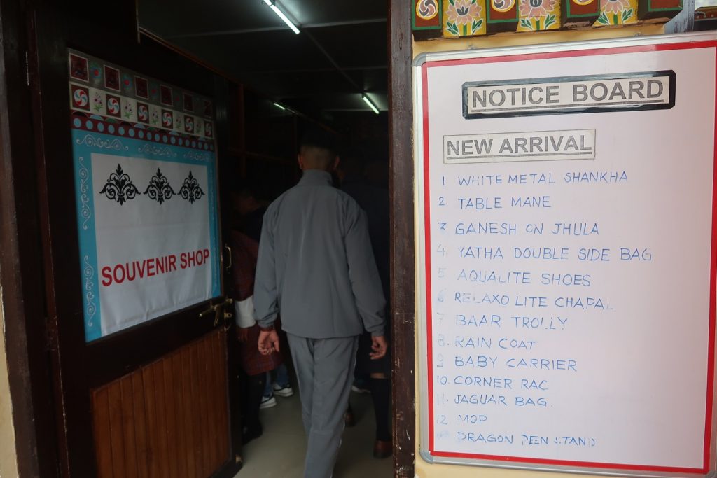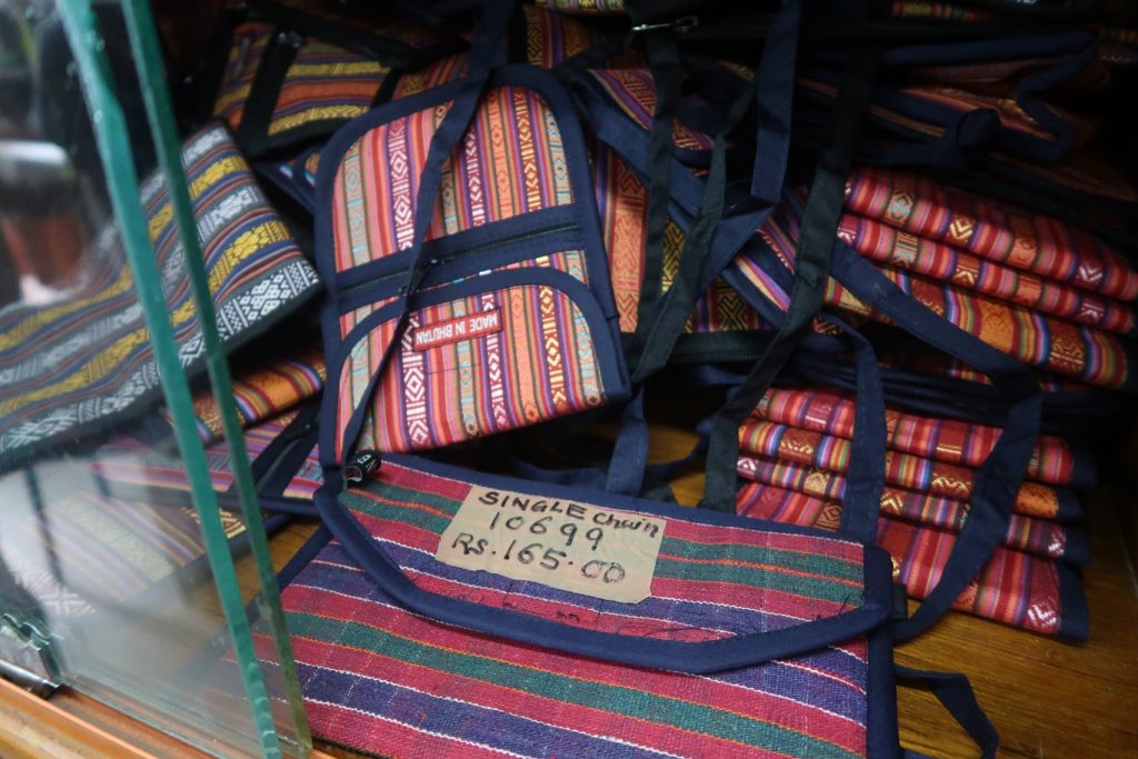 最後にお邪魔するのは雑貨屋。入口に「スーベニアショップ」とある通り、けっこうな種類のブータンみやげを扱っています。短期・長期でインドから赴任した皆さんが、ここでおみやげを買って帰国する由。ブータンっぽい財布やバッグ、ミニ経文旗、王様グッズ、Tシャツ、キーホルダーの類から、全然ブータンっぽくない(そもそもブータンで作られていない?)仏像まで。これらも市場より安めの値段設定。