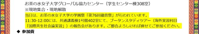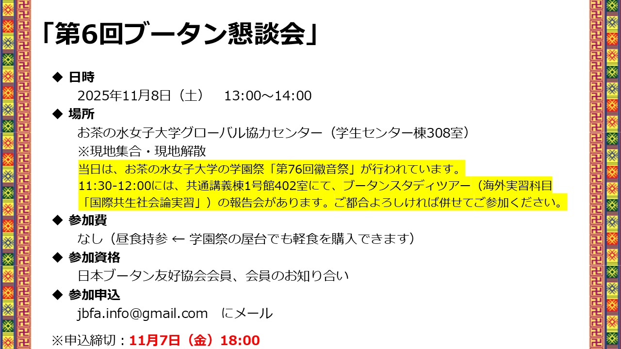 平山雄大が日本ブータン友好協会にて企画した「第6回ブータン懇談会」(於:お茶の水女子大学グローバル協力センター)が、2025年11月8日(土)に開催されます。