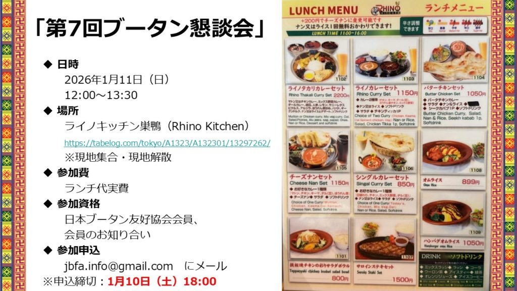平山雄大が日本ブータン友好協会にて企画した「第7回ブータン懇談会」(於:ライノキッチン巣鴨)が、2026年1月11日(日)に開催されます。