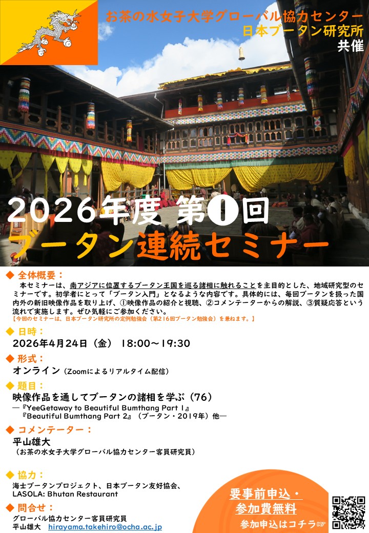 ※本勉強会は、日本ブータン研究所とお茶の水女子大学グローバル協力センターが共催する「2026年度第1回ブータン連続セミナー」として実施されます。
